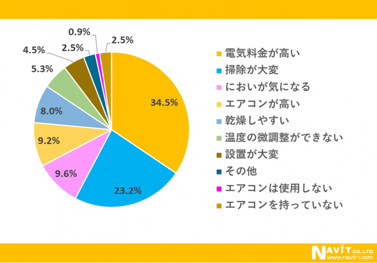 「エアコンに対する不満はありますか?」という質問を複数選択可能で行ったところ、「電気料金が高い」が34.5%、「掃除が大変」が23.2%、「においが気になる」が9.6%という順になりました。近年、電気料金も値上げされていますし、気にされている方が多いようですね。