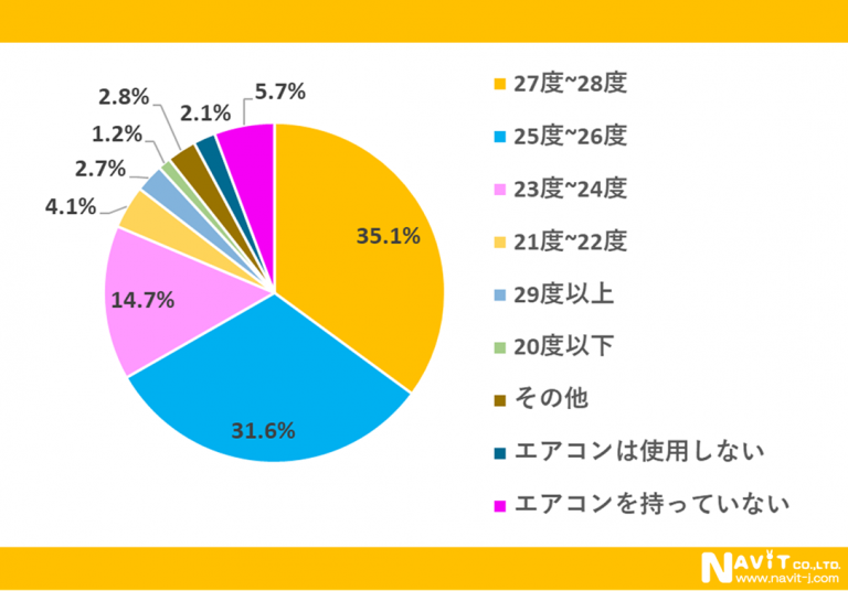 エアコンの設定温度については、「27~28度」が35.1%、「25~26度」が31.6%、「23~24度」が14.7%という順になりました。