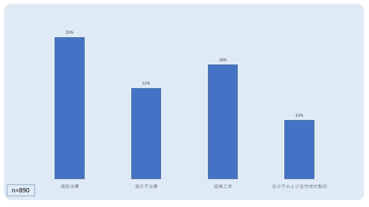 - 再生医療分野における製品タイプは、「細胞治療」が34.8%と最も多く、次いで「組織工学」(28.1%)、「遺伝子治療」(22.4%)となっています。また、「低分子・生物学的製剤」は14.6%と、最も利用されていない製品タイプでした。