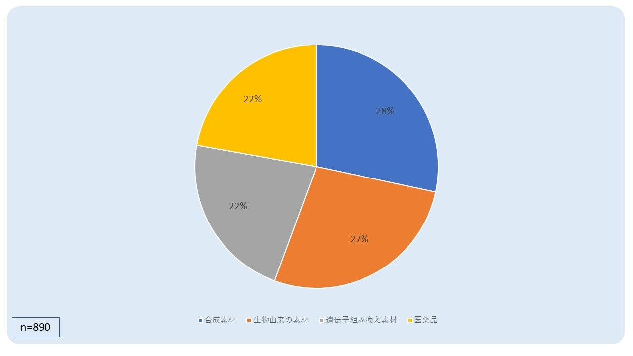 - 使用する素材の種類は、「合成素材」と「生物由来素材」が最も多く、それぞれ4分の1以上の回答者が選んだと報告されています。遺伝子組み換え材料と医薬品がそれぞれ回答の 22.4% を占めました。