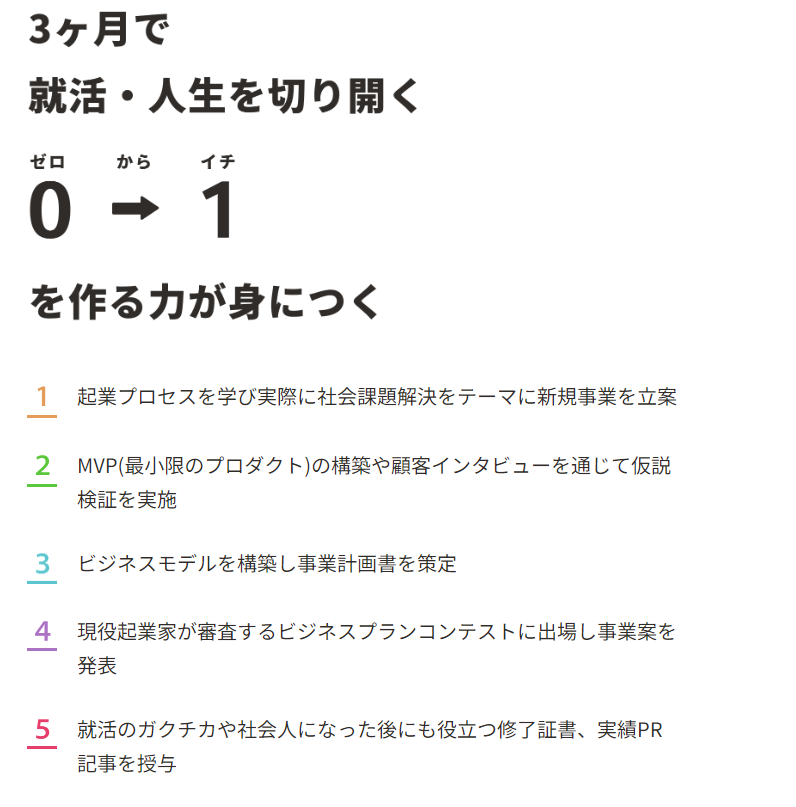 起業プロセスをゼロから段階的に学び、スタートアップスキルを身につけられる実践型ビジネススクールです。社会課題の解決に挑戦する社会起業家を発掘・育成し、日本のスタートアップ創出を支援することを目的としております。