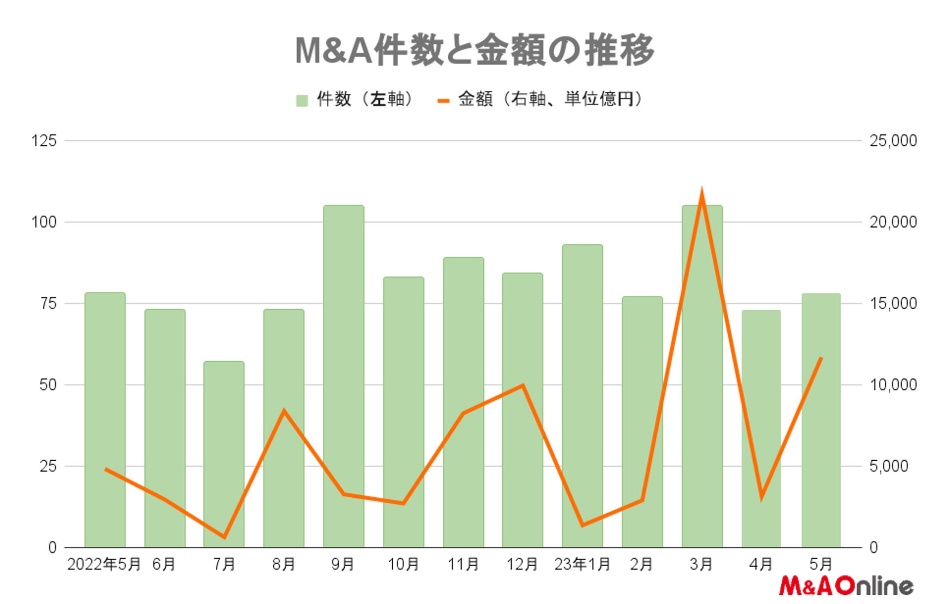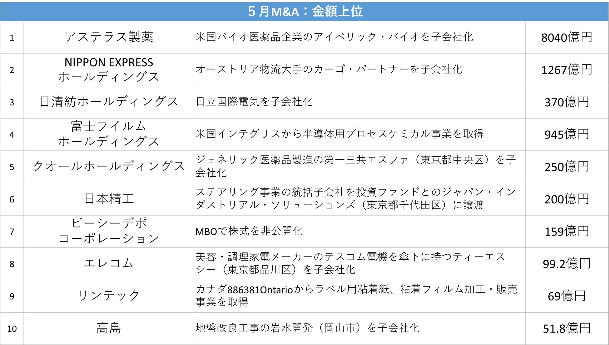 5月の取引金額(公表分を集計)は1兆1675億円。アステラス製薬が8040億円で米国のバイオ医薬品企業を買収する巨額案件が金額を押し上げました。