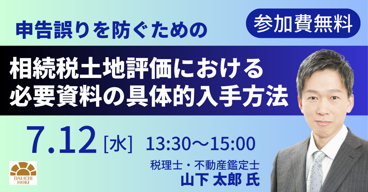 このセミナーでは、相続税評価に必要な土地評価資料の入手方法について、具体的な方法や注意点を解説します。講師の山下太郎氏は、国税調査官のご経験を持ち、現在は税理士・不動産鑑定士として数多くの相続業務を手がけています。
