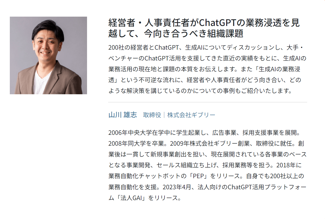 当日は、株式会社ギブリー、株式会社サイダス、株式会社LabBase、Thinkings株式会社、株式会社リーディングマークの約5社が集結し、人事が理解しておくべき「AI×人事業務」の動向を徹底的に語りつくします。