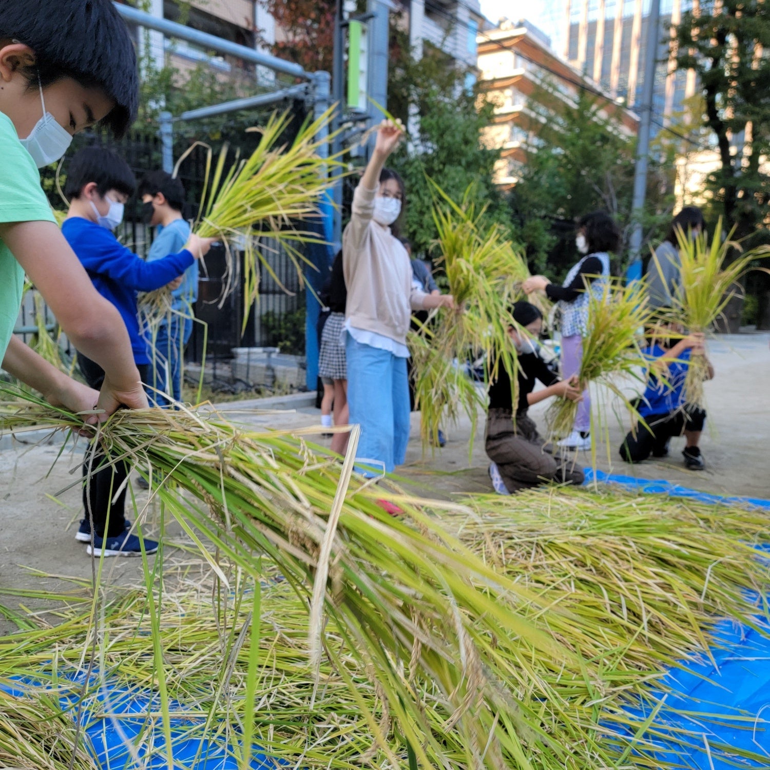 当社はCSR事業の一環として、山川九十九農園の監修のもと、品川区立御殿山小学校の校庭に設置されていた8年間未使用の田んぼを昨年再生させました。品川区立御殿山小学校の児童の保護者が運営する「親児の会」と共同で、田んぼの土を50cmまで掘り返し、スギナの群生していた根を取り除きました。有機肥料と粘土を加えて代掻きを行い、田植えの準備を整え、田植えから稲刈りまでを実施しました。