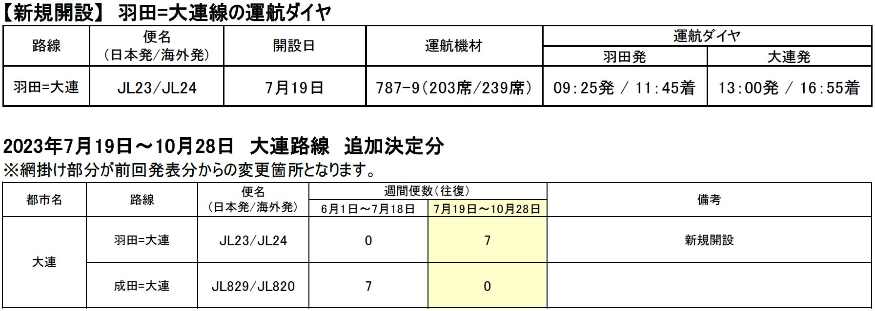 2020年3月の羽田空港発着枠の拡大以降、コロナ禍で開設延期としていた羽田=大連線について、7月19日から羽田空港第3ターミナルを新規運航便が使用するめどが立ったことから、今般、当該便を開設することを決定しました。
