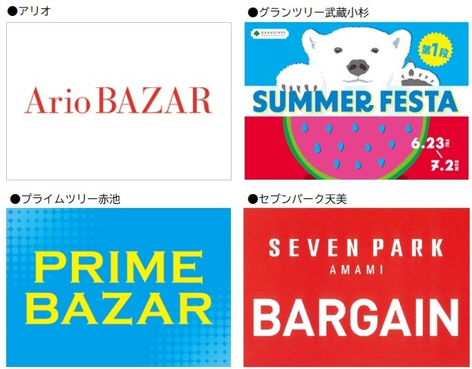 全国のアリオ19店舗で「Ario BAZAR」、グランツリー武蔵小杉「SUMMER FESTA」、プライムツリー赤池「PRIME BAZAR」、セブンパーク天美「SEVEN PARK AMAMI BARGAIN」を開催します。夏のファッションアイテムをはじめ、今ほしいものをご用意し、お客様にお得なお買物をお楽しみいただけます。