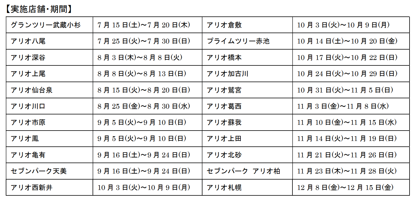 【実施店舗】:全国のアリオ19店舗・グランツリー武蔵小杉・プライムツリー赤池