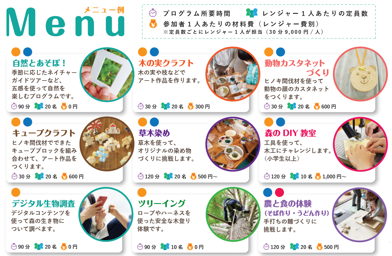 内容:森林環境学習プログラムの一部などを体験いただくことができます。