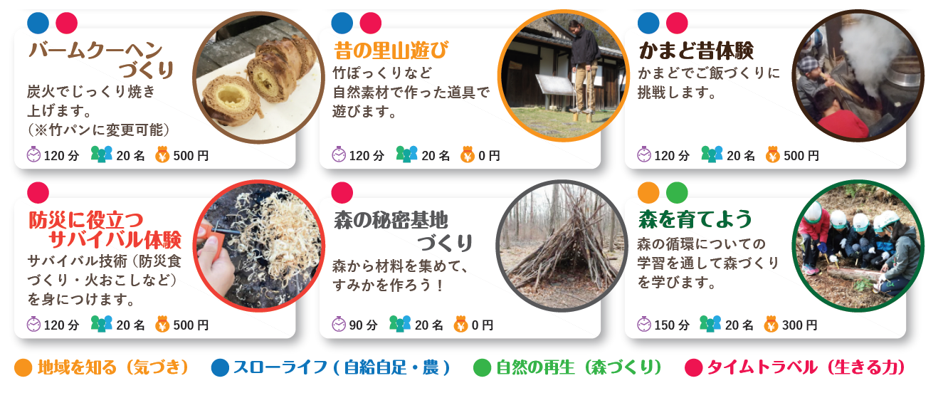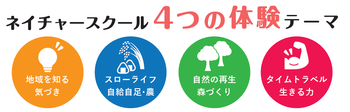 「自然を愛する力」「五感を使う力」「生きる力」を培うための4つの体験テーマに沿った様々なメニューをご用意しています。