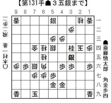 ▲同玉 △7四金 ▲5二銀 △2二玉 ▲3四桂 △1二玉 ▲5一銀不成△7六銀 ▲9七玉 △9五歩 ▲6二飛成 △9六歩 ▲8八玉 △3一歩 ▲7九玉 △6六角 ▲3二龍 △同歩 ▲2三飛成 △同 玉 ▲2四歩 △同玉 ▲3五銀 まで131手で先手の勝ち