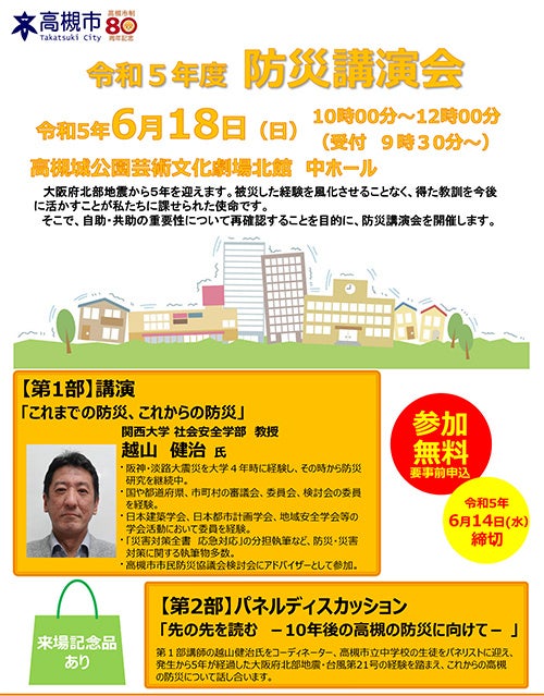 本市では、南海トラフ地震などの大規模災害に備える必要性が高まるなか、大阪府北部地震で得た教訓を風化させることなく、今後の防災に活かすことが求められています。そこで、地震から5年が経過するにあたり、市民の皆様に防災の重要性を再確認していただくことを目的に、防災講演会を開催します。