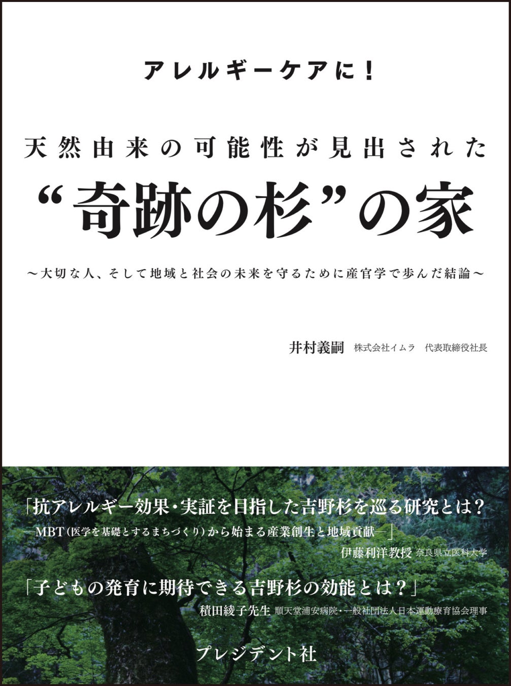 「住宅業界は、地場産業である」を信念に、イムラは約20年にわたり、吉野杉を使った上質な住まいづくりによって、吉野杉の需要を産む取り組みを続けてきました。2000年以降、川上産吉野材販売促進協同組合と独自の産地直送ルートで吉野杉を調達し、住宅に全面的に採用。吉野林業の再生と森林保全に向けた「産官」のビジネスモデルができあがりました。そして、2016年に新たな取り組みをスタート。「吉野杉の家」に住まわれるお客様からアトピーや喘息などのアレルギー症状が緩和したという声が増えてきたことをきっかけに、奈良県立医科大学に協力を仰ぎ、研究を開始。約6年の研究の結果、川上村産の吉野杉にはアレルギーを発症しにくくする物質が多く含まれていることが判明しました。そしてこれまでの「産官」から「産官学」へと連携が拡大。「吉野杉の家」づくりを中心とした「地方創生」「循環型社会」の構築への取り組みについてまとめました。