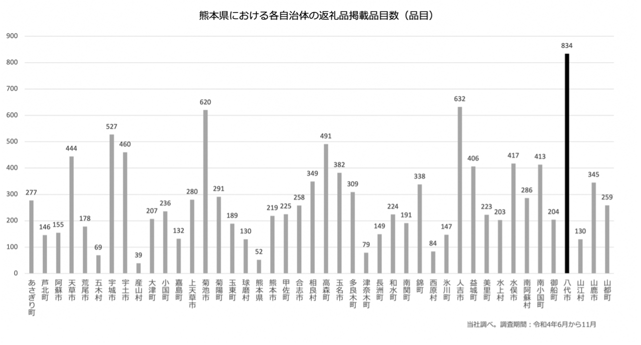 そんな八代市ではありますが、ふるさと納税に積極的に取り組んでいる事業者さんと一緒にがんばっています。現時点で、事業者は約180事業者。返礼品で1000品目ほどあります。