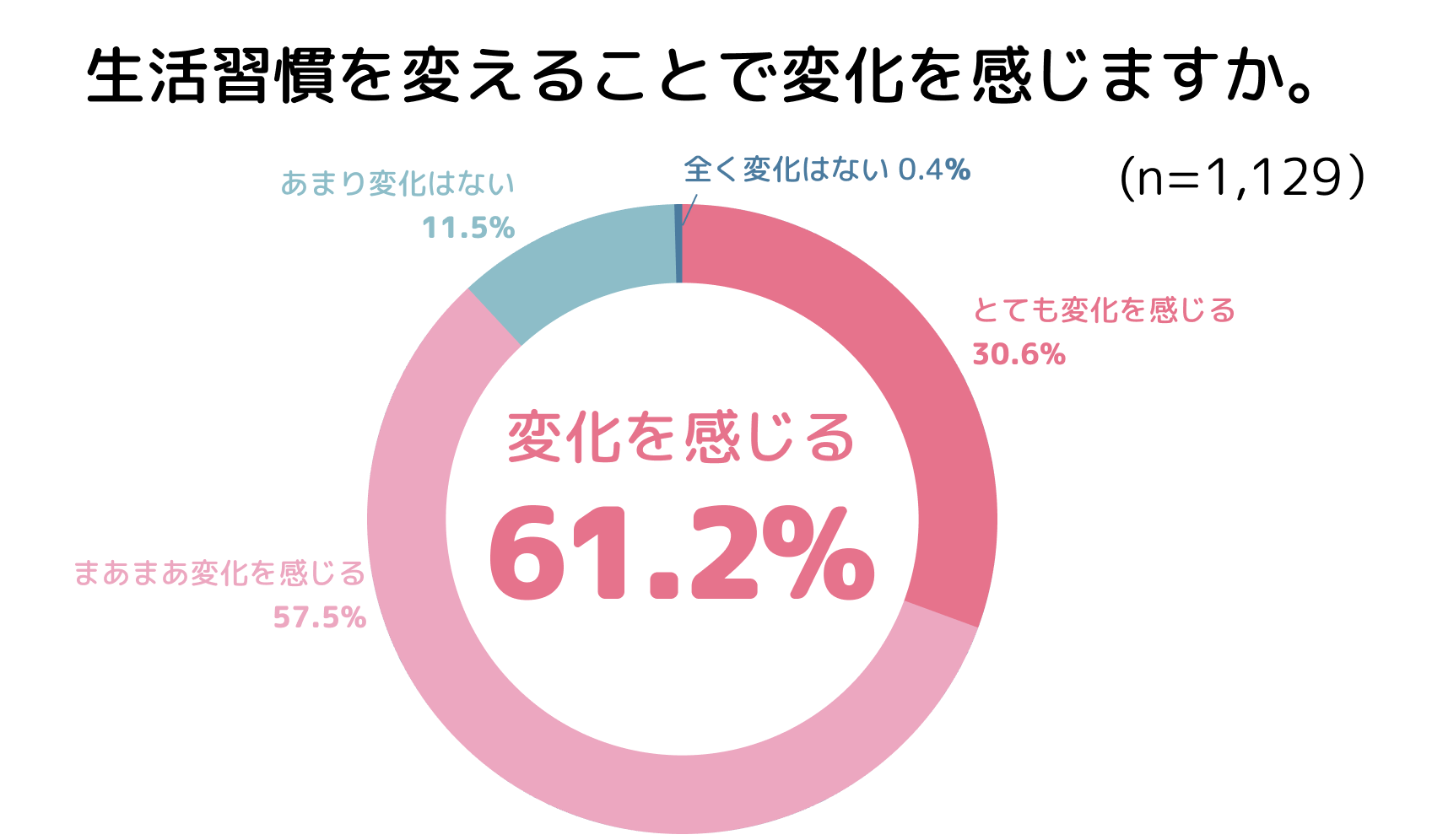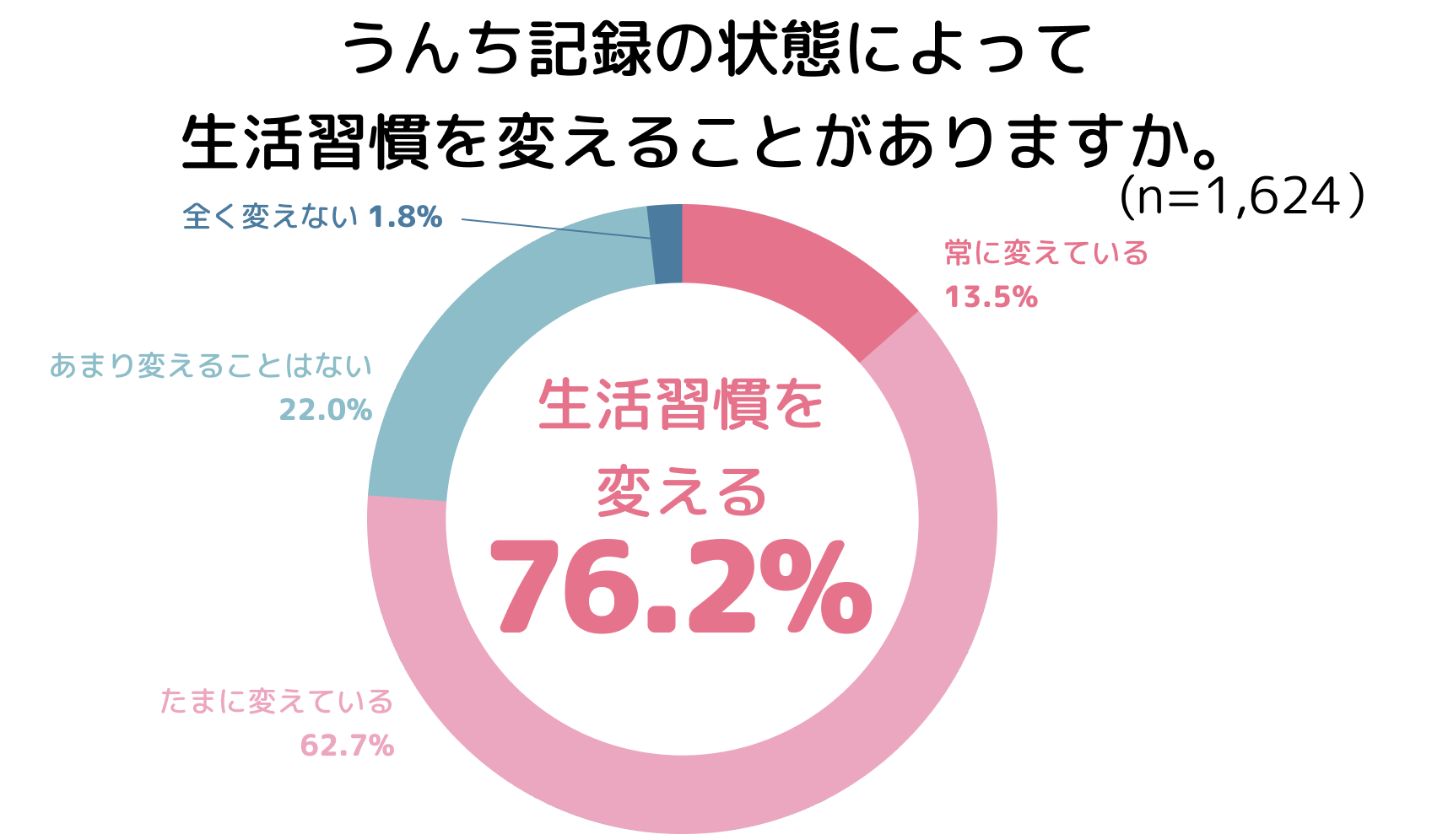 うんち記録を見返すことで、食事・睡眠・運動などの生活習慣を変えることがある人は、76.2%にのぼりました。また、その中でも61.2%の人が、生活習慣を変えることで何かしらの変化を感じていると回答しています。
