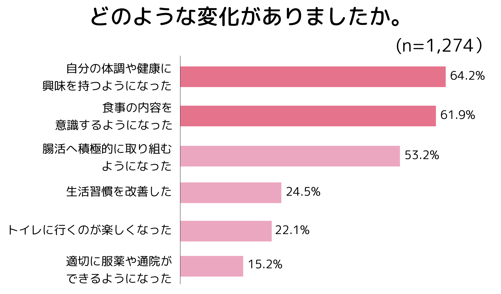うんち記録をつけることで、78.5%の人が何かしらの変化を感じていると回答しました。具体的には、「自分の体調や健康に興味を持つようになった」、「食事の内容を意識するようになった」などが6割を越えています。うんちを通じて、自分自身の状態や選択肢に対して意識が向くようになっていることがわかります。