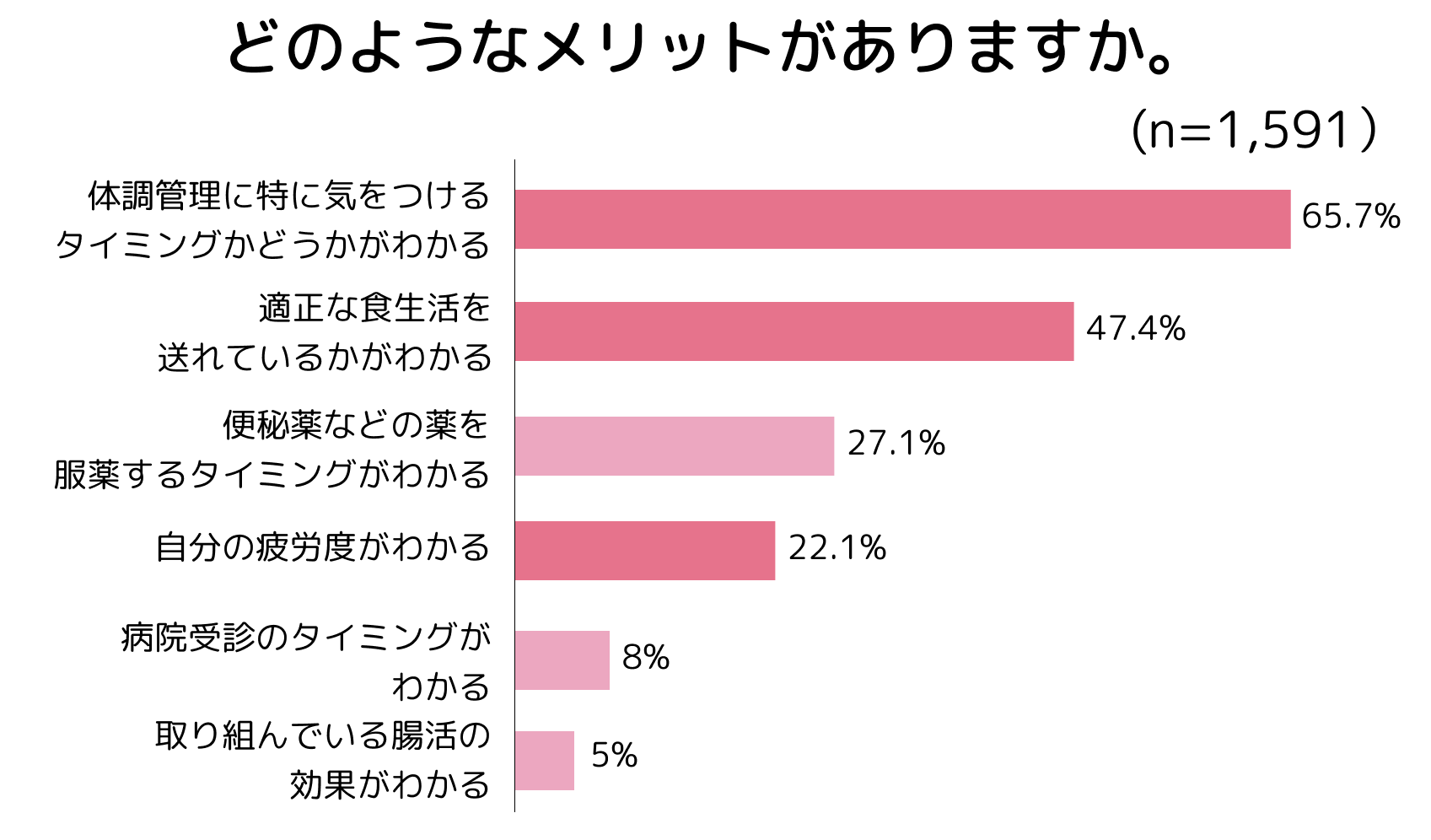 97.9%の人が、うんち記録をつけることに対してメリットを感じています。主な内容としては、「体調管理を特に気をつけるタイミングかどうかわかる」、「適切な食生活が送れているかどうかわかる」、「自分の疲労度がわかる」などが上位です。自分自身の健康のバロメーターとしてうんちを活用できることがメリットとして捉えれらえていることがわかりました。