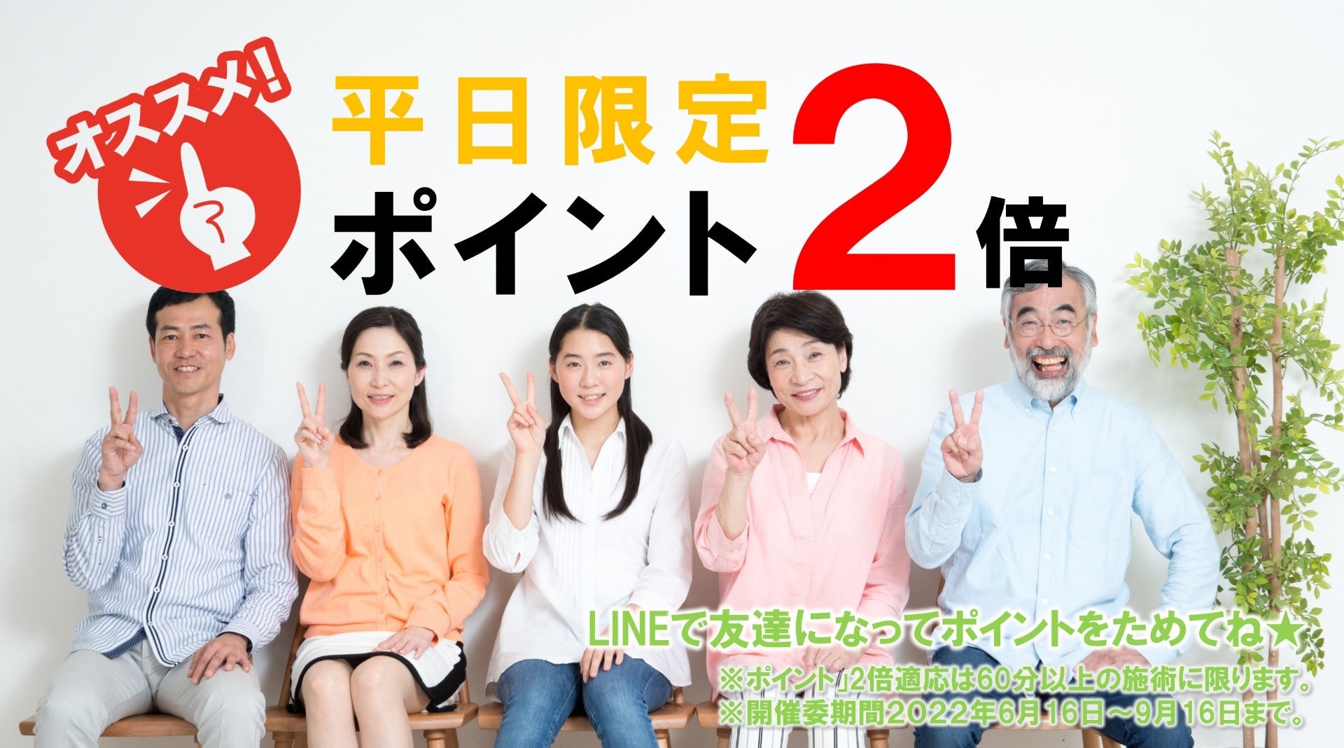 ・60分以上の施術のみ、ポイント2倍(通常:60分2ポイント→4ポイント、120分4ポイント→8ポイント)