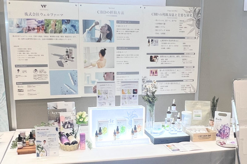 株式会社ウェルファーマのブースでは、医療機関専売CBDブランド『Bicle(ビクル)MED』をはじめ、一般販売のBicleブランド製品、ペット用CBDブランドM&N’s(エムアンドエヌズ)、そしてデリケートゾーンケアブランドfuwari(ふわり)の製品を出展。