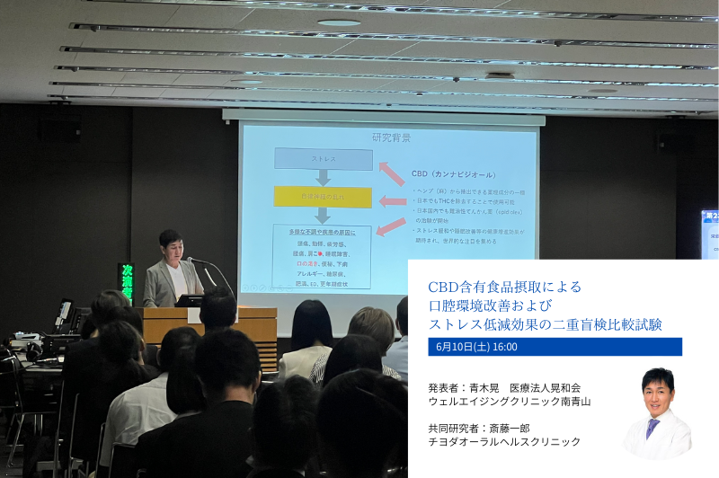 株式会社ウェルファーマは、学会中一般講演において、独自に行ったCBDにおける臨床研究『CBD含有食品摂取による口腔環境改善およびストレス低減効果の二重盲検比較試験』を発表。