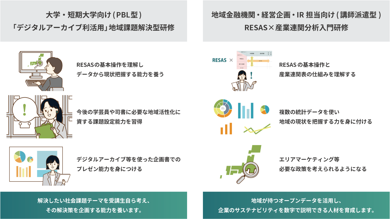 「まちづくりの誠勝」は、RESAS(地域経済分析システム)などの公的データベースの活用方法や分析手法の学習・実習を通じ、地域課題の解決に取り組むうえで必要なデータ分析、課題設定、施策の評価といったスキル、すなわち”地域課題発見力”を持った人材の育成を支援するサービスです。主に学芸員・学芸員補などを目指す大学生、短大生を対象とした『デジタルアーカイブ利活用・地域課題解決型研修』 と、企業の経営企画・IR・ESG開示業務担当者など対象とした 『RESAS×産業連関分析入門研修』の2つのコースを提供しています。いずれのコースにおいても参加者は、昨今日本国内においても注目度が高まっているEBPM(エビデンスベーストポリシーメイキング。合理的根拠に基づく政策立案)のエッセンスを学ぶことが可能です。またお客様のニーズに応じ、研修内容のカスタマイズも可能です。詳細は「まちづくりの誠勝」ウェブサイトをご覧ください。