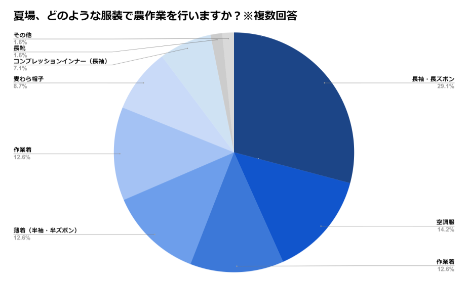 夏場どれだけ暑くても、農作物で肌を傷つけたり虫に刺されたり、農薬が皮膚に付着したりすることを防ぐために、肌を露出しない長袖・長ズボンが基本で、その服装に空調服や麦わら帽子、コンプレッションインナーをあわせて着用するという生産者様が多数おられました。この結果から安全対策をしつつ、暑さ対策も行うことが重要だと改めて感じました。生産者様により良い情報を提供するべく、今後更に詳しく、生産者様に人気のメーカーや商品を調査していくことを検討してまいります。農機具王は農業業界を盛り上げていくことを目的に、今後も生産者様を対象として調査を行っていきます。