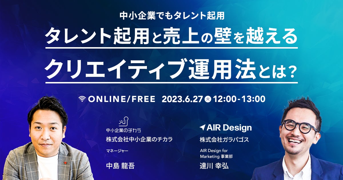 本セミナーでは、中小企業向けタレント活用サービスの発起人である中小企業のチカラと「Webマーケ×デザイン」のプロ集団AIR Designが、タレント起用のリアルと、認知形成からCV獲得までの具体的な戦略の立て方についてお伝えします。