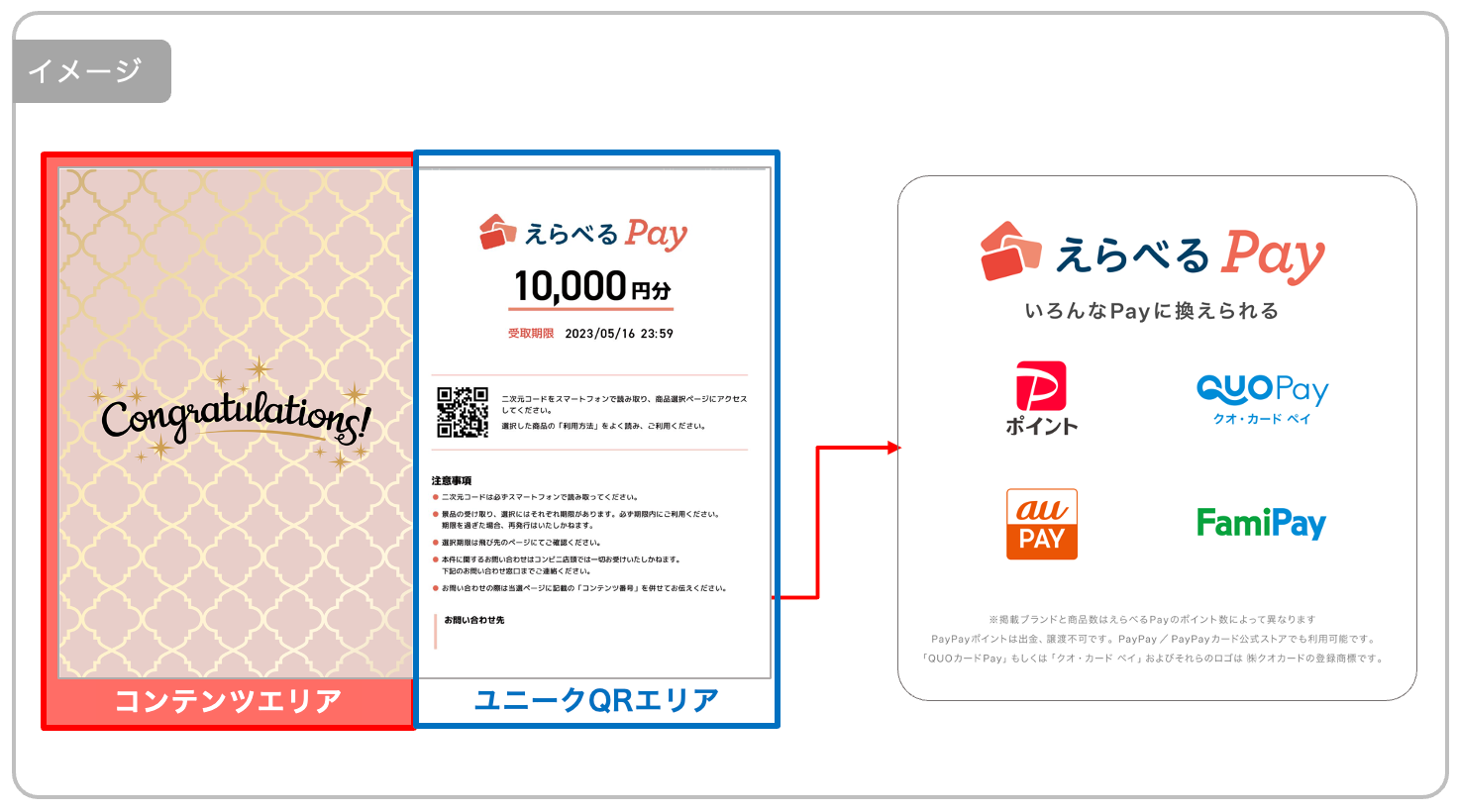コンビニエンスストアで印刷した際に、一定の確率で「あたり」を出すことができる「プリントリワード機能」もご提供可能です。プリントリワード機能とは、一定の確率でデジタルギフト「えらべるPay®︎」付きの「あたり」を出せる機能です。「コンテンツエリア」と「ユニークQRエリア(詳細説明含)」が半面ずつ印刷されます。 お客様の期待感を高めることで、引換率(印刷率)を向上させる効果が期待できます。