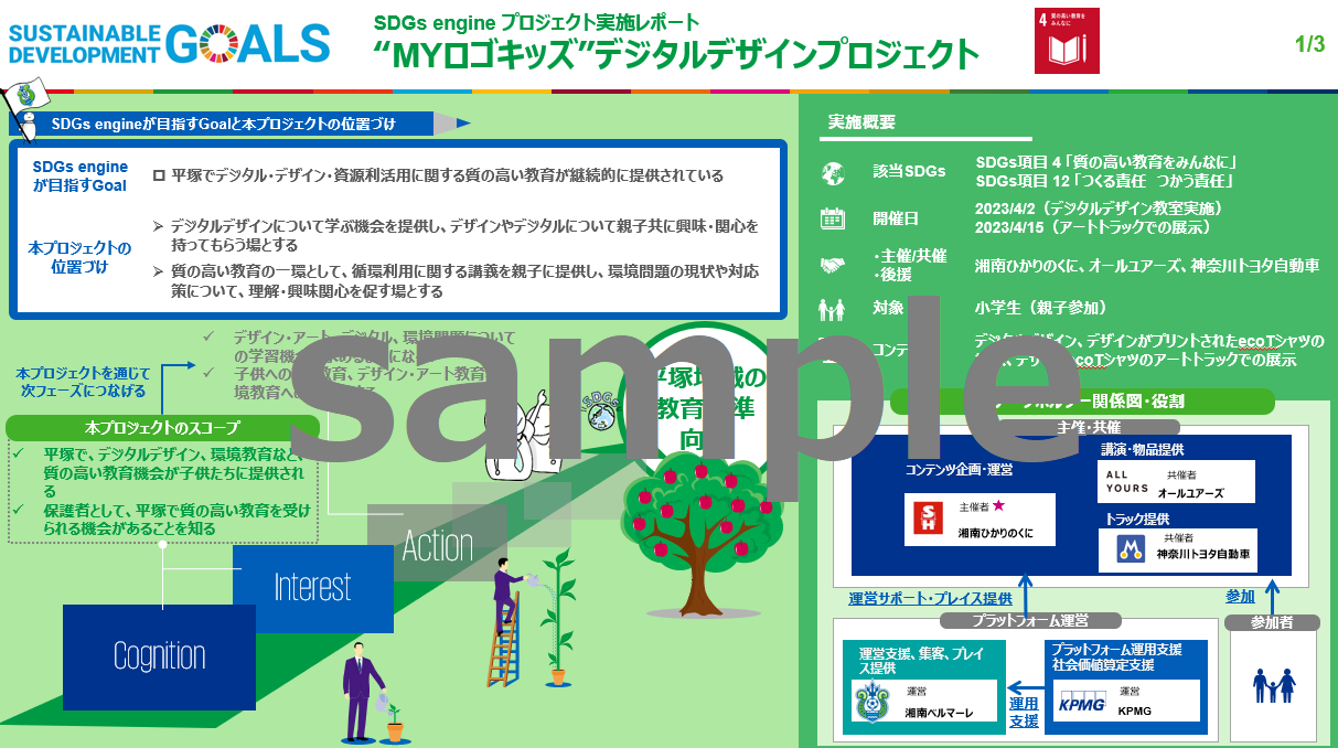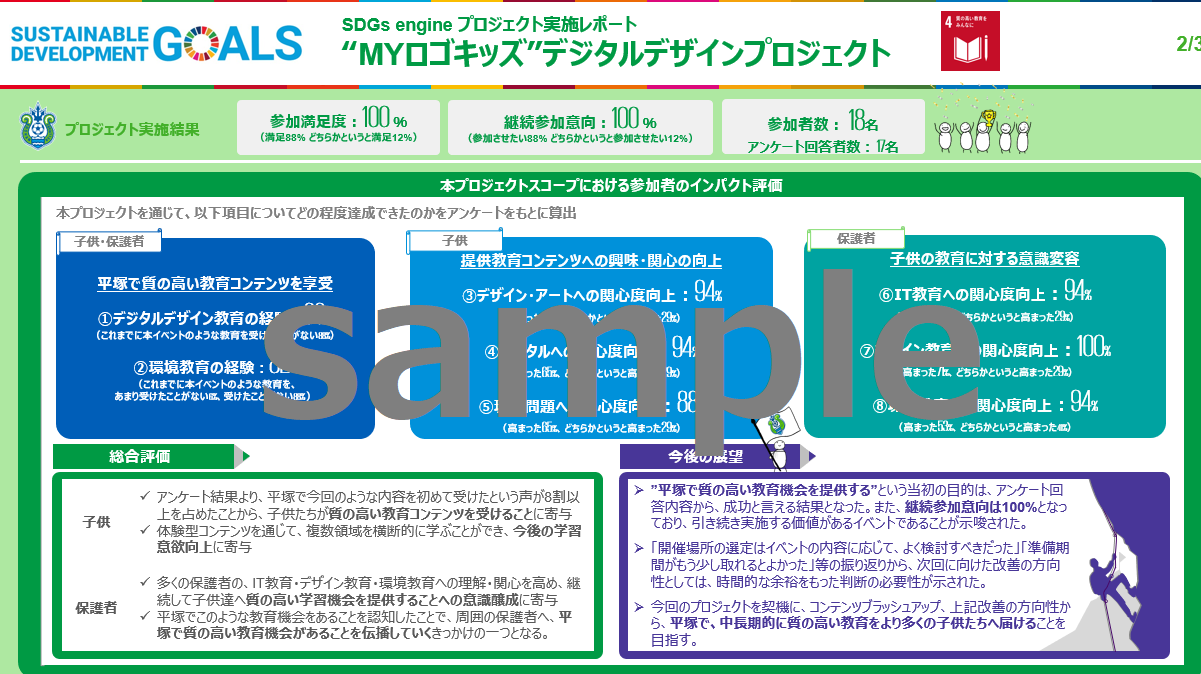 この「SDGs engine(エンジン)」を全展開する準備段階として、「SDGs engine(エンジン)」α版を活用し、パートナー企業12社と協創して「プログラミング教室」や「植樹体験」、「サッカー教室&熱中症予防セミナー」、「デジタルデザイン教室」、「スポーツの価値と可能性を見つけるワークショップ」の5つの体験型研修プロジェクトをすでに組成・実施しました。また、それぞれのプロジェクトにおいて「社会的な価値算定レポート」も作成・提供。これによって企業は、”実施して終わり”のSDGsアクション報告とは異なる、定量的なインパクト評価に基づく説明力のあるマーケット発信が可能となります。