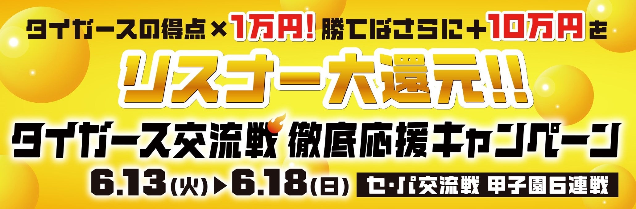 6月13日(火)から甲子園で行われるセ・パ交流戦6連戦、ABCフレッシュアップベースボールではタイガースの得点×1万円、勝てばさらに+10万円を1名の方にプレゼント!