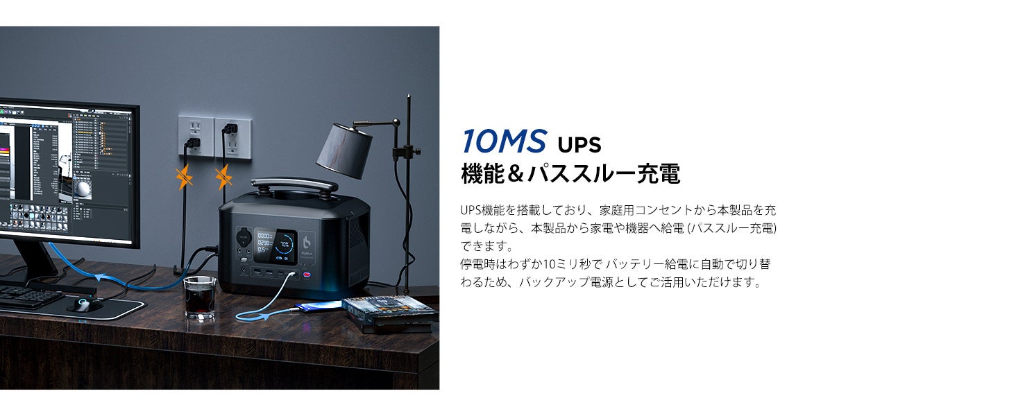✅【業界最速10ms UPSとパススルー充電】停電時はわずか10ミリ秒(※1) で バッテリー給電に自動で切り替わるため、バックアップ電源としてご活用いただけます。大型4.3LCDリアルタイムディスプレイは、電流、電圧、充電時間、温度、警告などを表示します。騒音や煙がなく、安心してご利用いただけます。