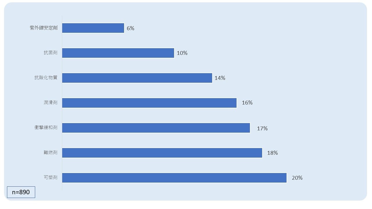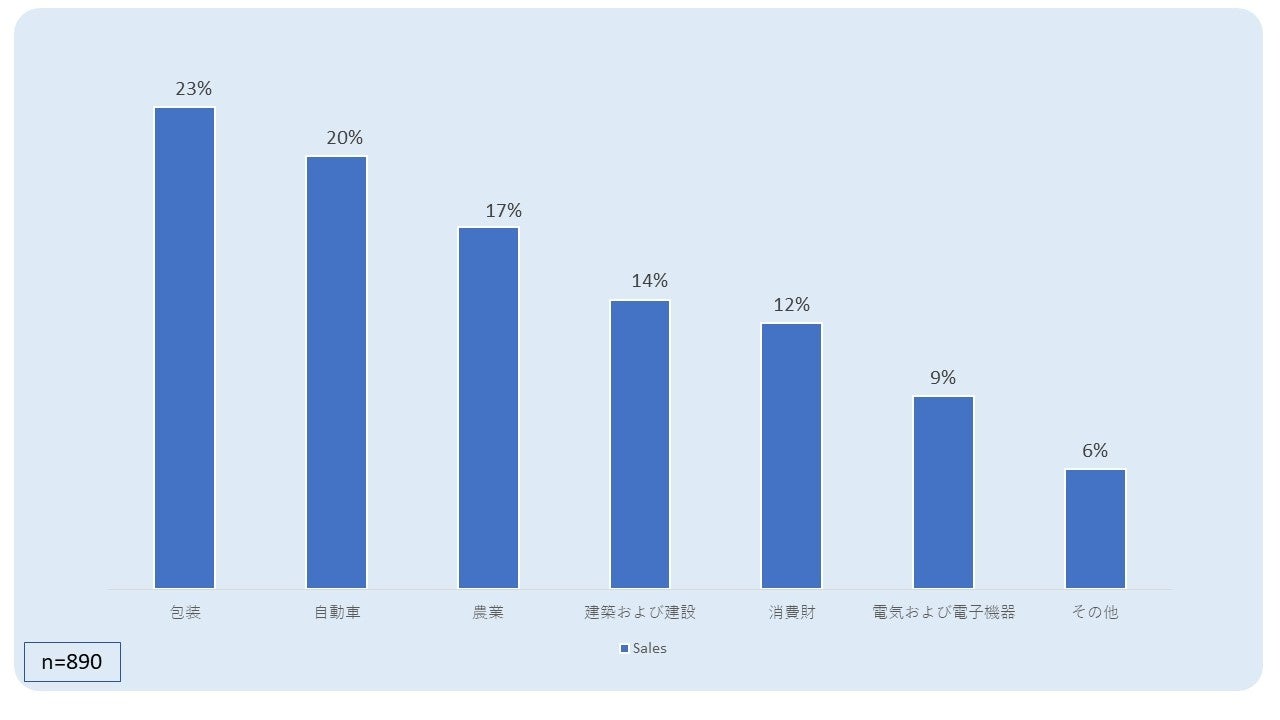 - この調査では、プラスチック添加剤の主な用途についても調査しました。これは、プラスチック添加剤が、包装材料の耐久性、柔軟性、総合的な性能を向上させるために不可欠な役割を果たしていることを表しています。また、「自動車」(20.2%)、「農業」(16.9%)なども挙げられ、幅広い産業でプラスチック添加剤の利用が進んでいます。