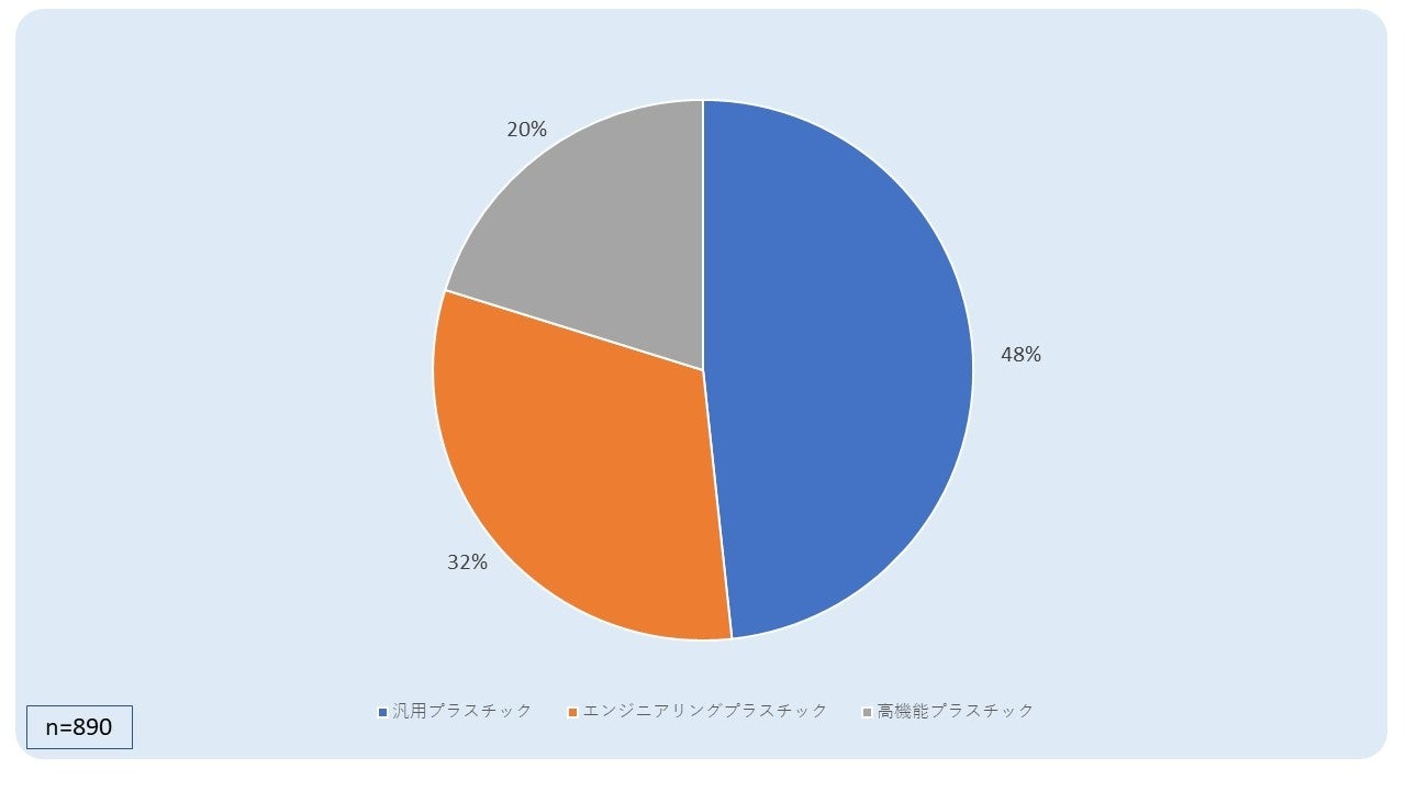 - 使用するプラスチックの種類については、半数以上の回答者(48.3%)が「汎用プラスチック」を主に使用していると回答しています。一方、エンジニアリングプラスチックは31.5%、高機能プラスチックは20.2%と大きなシェアを占めており、高強度、耐熱性、耐久性などの高度な特性が求められる用途で大きな役割を果たしていることが判明しています。