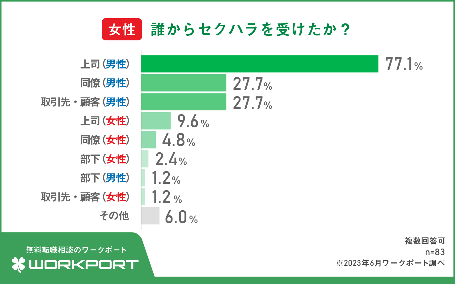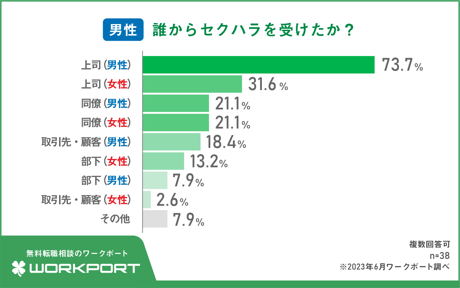 ちなみに、前出の回答を男女別に集計したところ、男性の回答でも「上司(男性)」(73.7%)や「同僚(男性)」(21.1%)が上位に入るなど、同性からセクハラを受けたことがある人も少なくないことがわかりました。