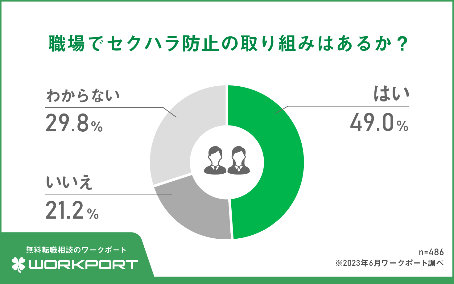 続いて、対象者全員に勤務先(または直近の勤務先)でセクハラ防止に関する取り組みが行われているか聞いたところ、「行われている」と回答した人は49.0%と約半数を占めました。