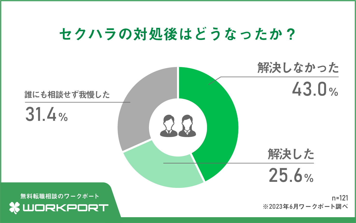 さらに、セクハラを受けたとき前出のような対処をとった結果どうなったか聞いたところ、43.0%が「解決しなかった」と回答し、「解決した」と答えた人は25.6%でした。前出の回答では、上司や同僚を頼った人もそれぞれ約30%いることや職場の相談窓口を利用した人も一定数いることがわかっていますが、結果として解決には至らなかった人が約半数におよび、解決した人は3割にも満たないという状況が明らかになりました。
