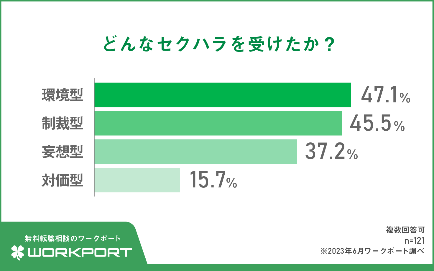 次に、セクハラの種類を「対価型」「環境型」「制裁型」「妄想型」の4タイプ(※)に分類し、前出の質問の回答者にどんなセクハラを受けたか聞いたところ、「環境型」が47.1%と最も多く、「制裁型」もほぼ同数の45.5%でした。