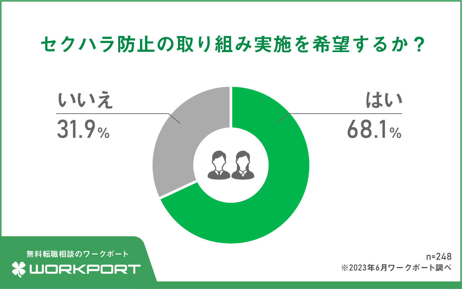 最後に、直近の職場でセクハラ防止の取り組みがない、もしくはわからないと回答した人に、セクハラ防止に関する取り組みの実施を希望するか聞いたところ、約7割にのぼる68.1%の人が「希望する」と回答しました。