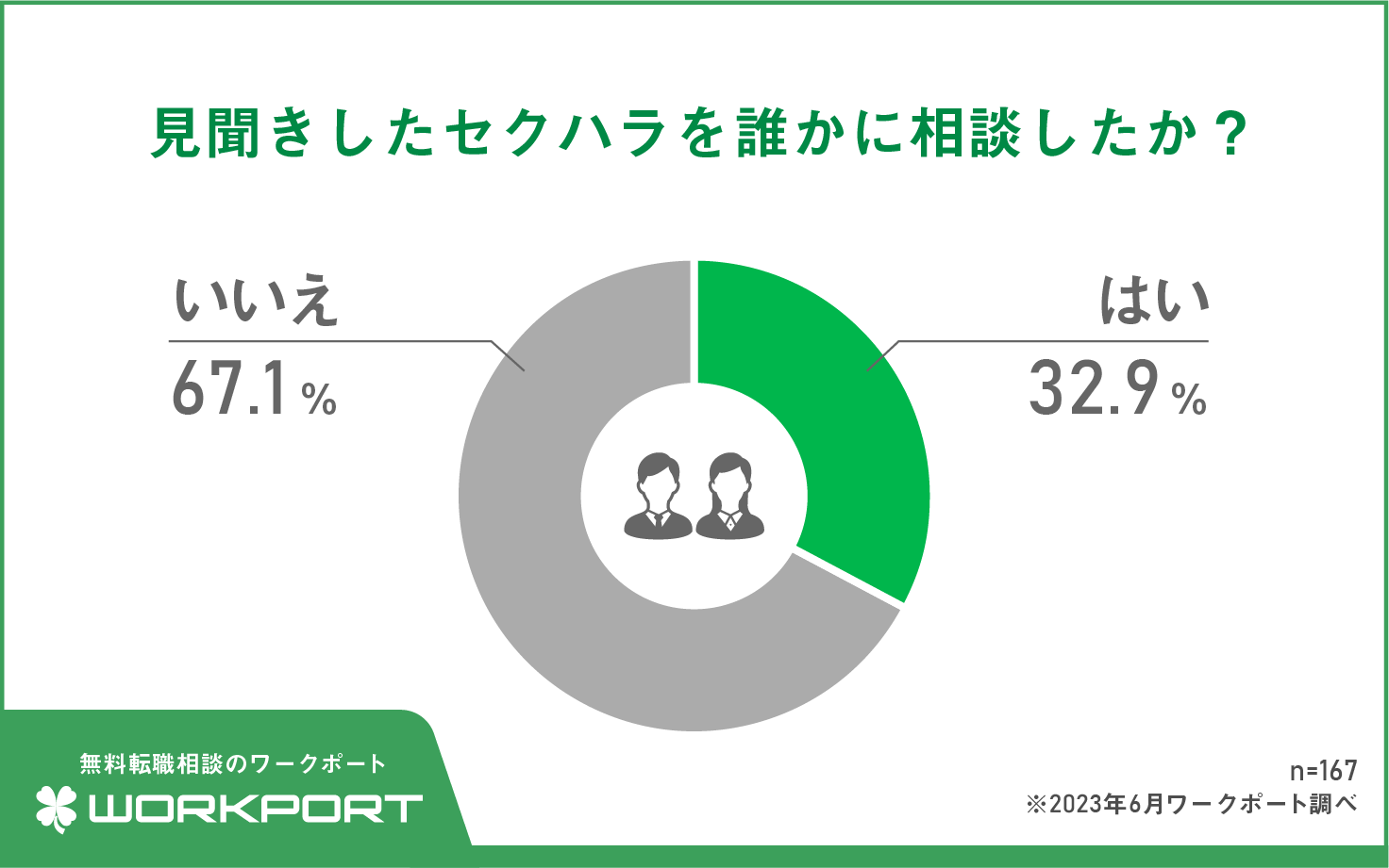 職場でセクハラを見聞きしたことがあると回答した人に、見聞きしたセクハラを誰かに相談したか聞いたところ、「相談した」とする人は32.9%でした。職場でセクハラを見聞きしても、自分で行動を起こすことはしない・あるいはできないという人が多い傾向が読み取れました。