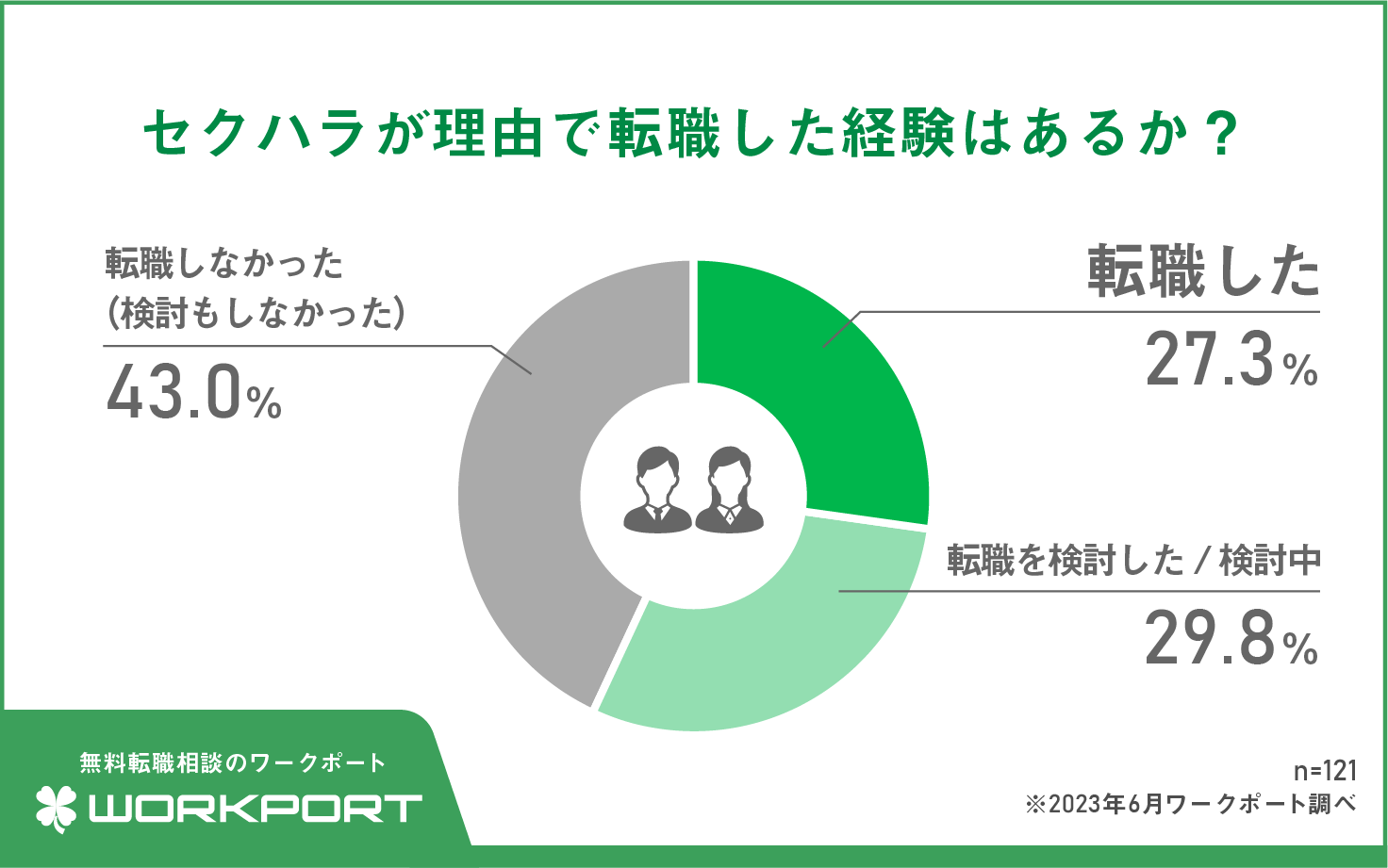 職場でセクハラを受けたことがあるとする人に、セクハラが理由で転職した経験はあるか聞いたところ、「転職した」(27.3%)、「転職を検討した/検討中」(29.8%)が合わせて57.1%でした。被害経験を持つ人のうち半数以上にとって、セクハラが転職を検討するきっかけや決意した理由となったことがわかりました。