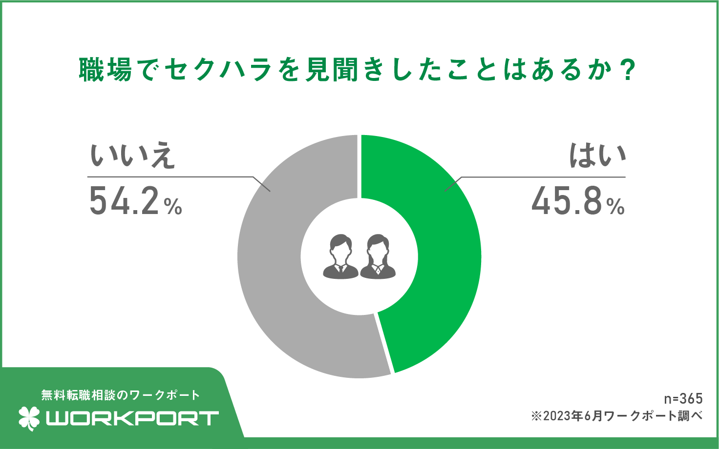 次に、セクハラの被害経験はないとした365人に、これまで職場でセクハラを見たり聞いたりしたことはあるか聞いたところ、45.8%の人が「ある」と回答しました。自身がセクハラ被害に遭ったことのない人でも、そのうち約半数は職場でセクハラを見聞きした経験を持っていることがわかりました。