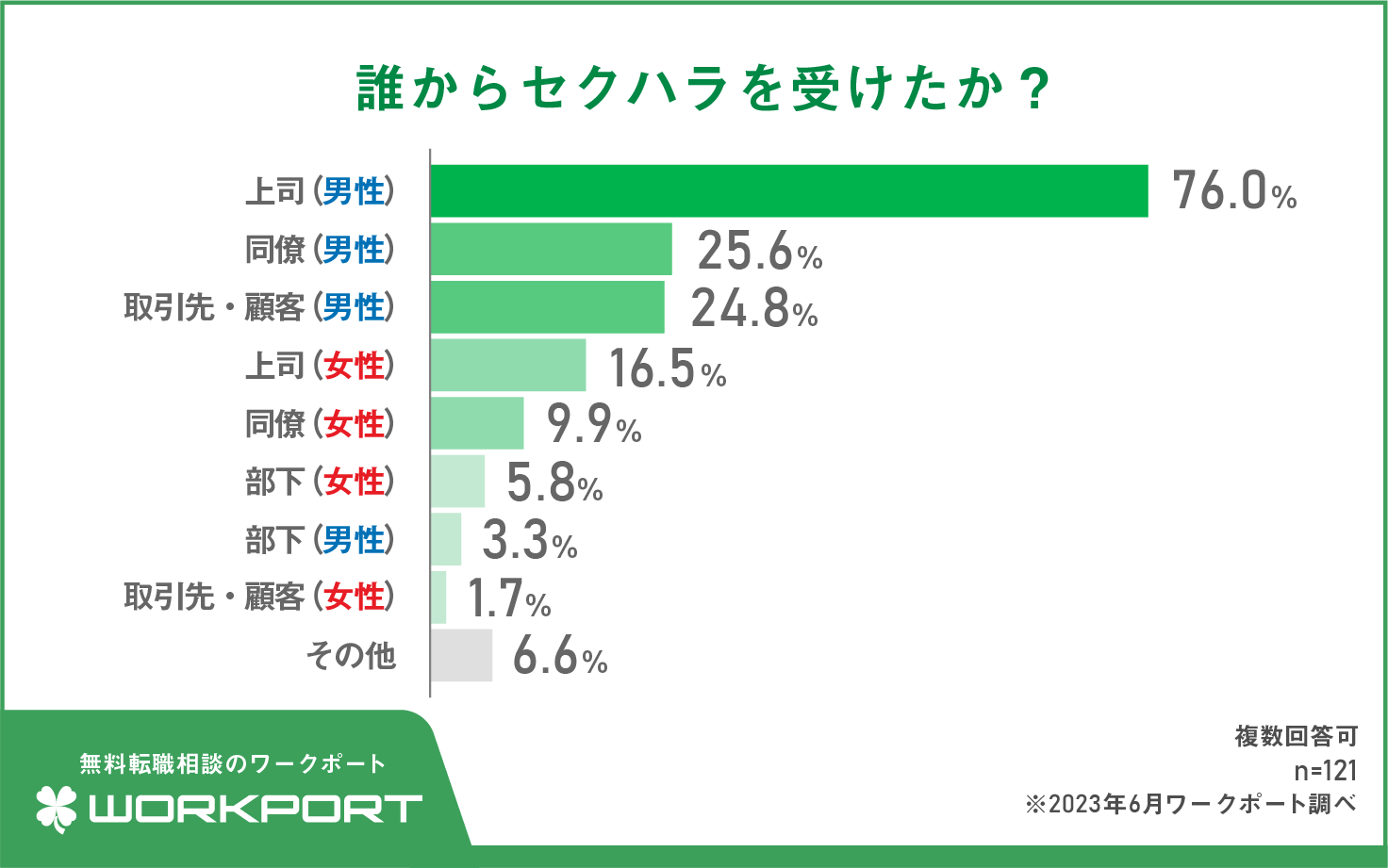 職場でセクハラを受けたことがあると回答した人に、誰からセクハラを受けたか聞いたところ、「上司(男性)」が76.0%で最多となりました。次いで、「同僚(男性)」が25.6%、「取引先・顧客(男性)」が24.8%と、どちらも30%近くにのぼる結果となりました。