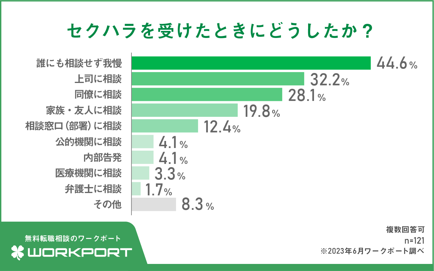 続いて、職場でセクハラを受けたことがあると回答した人に、セクハラを受けたときにどうしたか聞いたところ、「誰にも相談せず我慢した」が44.6%で最も多い結果となりました。次いで、「上司に相談」が32.2%、「同僚に相談」が28.1%でした。