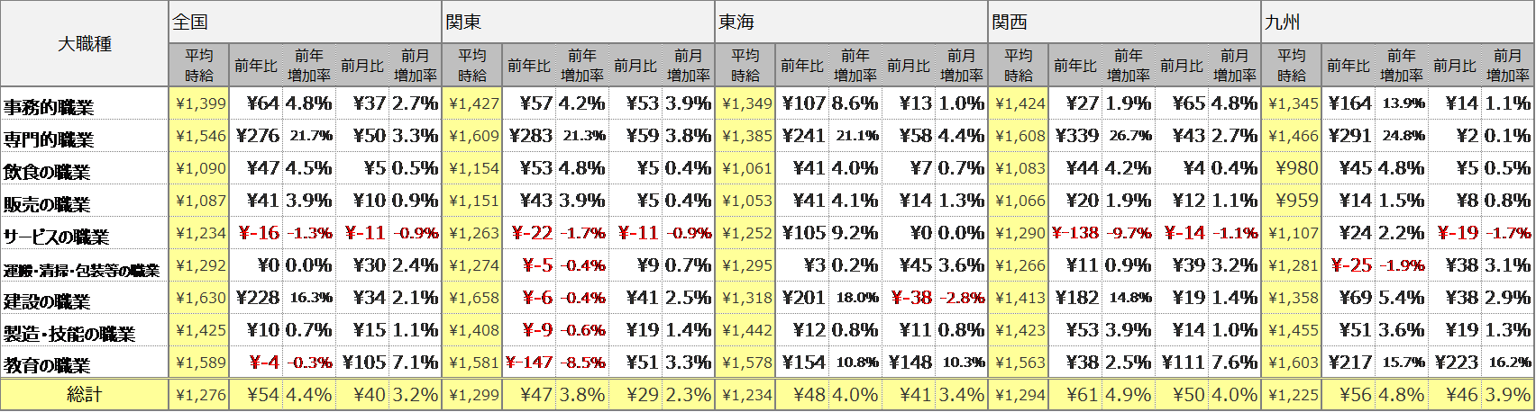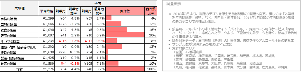 関東エリアの平均時給は1,299円(前年47円増、前月比29円増)、東海エリアの平均時給は1,234円(前年比48円増、前月比41円増)、関西エリアの平均時給は1,294円(前年比61円増、前月比50円増)、九州エリアの平均時給は1,225円(前年比56円増、前月比46円増)となりました。