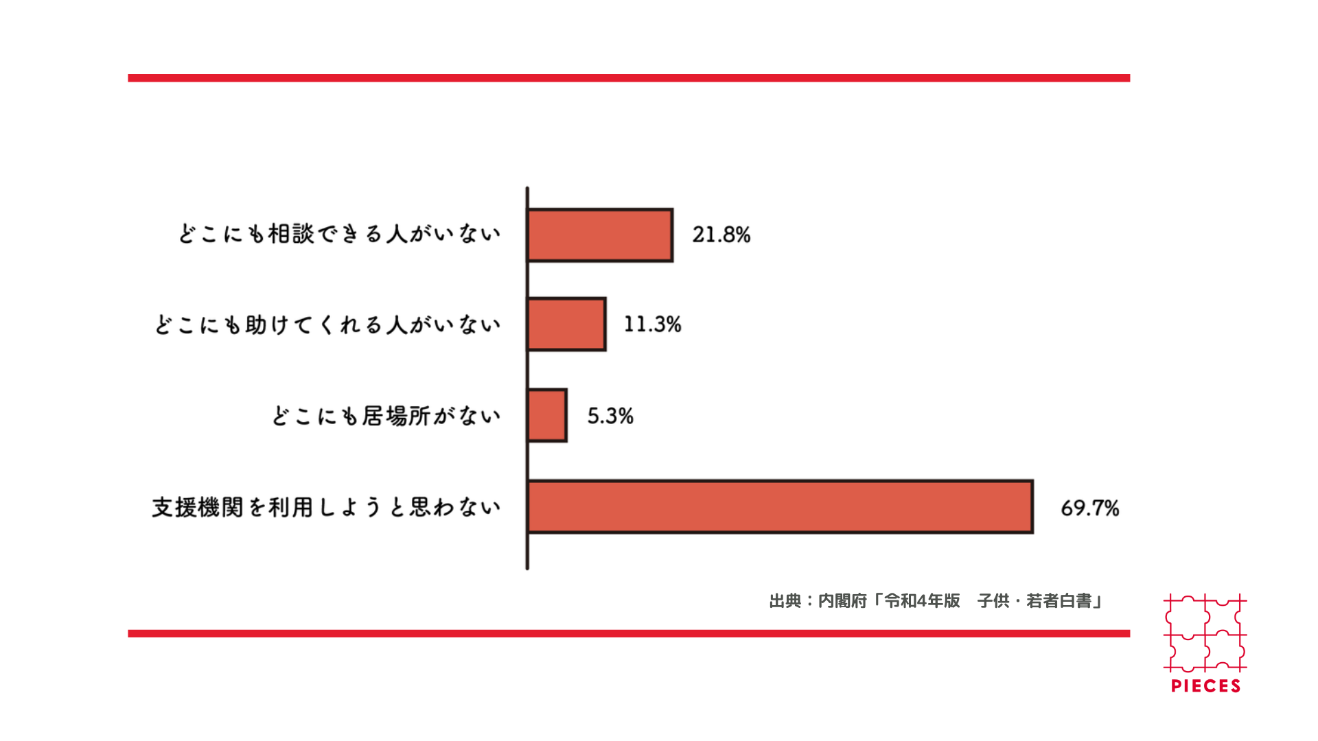 予想を上回るペースで少子化が進む日本において、子どもを取り巻く状況も、虐待やいじめ、不登校等など深刻な問題が顕在化しています。令和4年版子供・若者白書によると「いざというときに頼れる大人がいない」と感じている子どもは21.8%、さらに「支援機関を利用しようと思わない」は69.7%にも上ります。