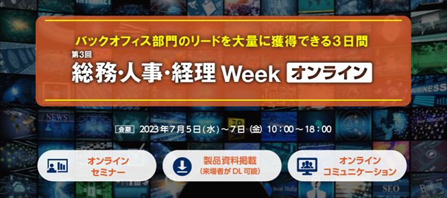 バックオフィス向け製品・資料と、オンラインセミナーが一堂に集結するオンラインイベントです。働き方改革、HRソリューション、福利厚生・健康経営、会計・財務、法務・知財など、9つの製品分野が出展します。オンライン上で資料ダウンロードやセミナー受講ができるだけでなく、その場で商談・チャットができるシステムを導入する事で、双方向のコミュニケーションを実現しました。出展社は気軽にホットリードを獲得でき、来場者は効率よく情報収集・比較検討ができる絶好の機会です。