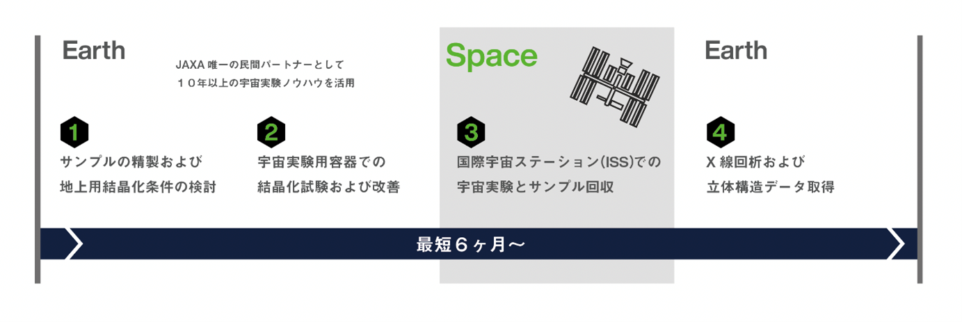 Space BDではISS「きぼう」船内実験設備を活用し、微小重力空間の特性を活かした高品質なタンパク質結晶の生成技術を使用しライフサイエンス事業「タンパク構造解析サービス」を展開しています。本サービスでは、創薬研究で重要となる、ターゲットタンパク質構造情報の決定と化合物等との相互作用の検証を支援しています。