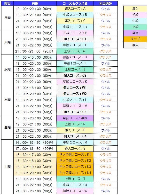 ■グループレッスン(導入、初級1、初級2、中級1、中級2、上級:90分、発音実践:60分)