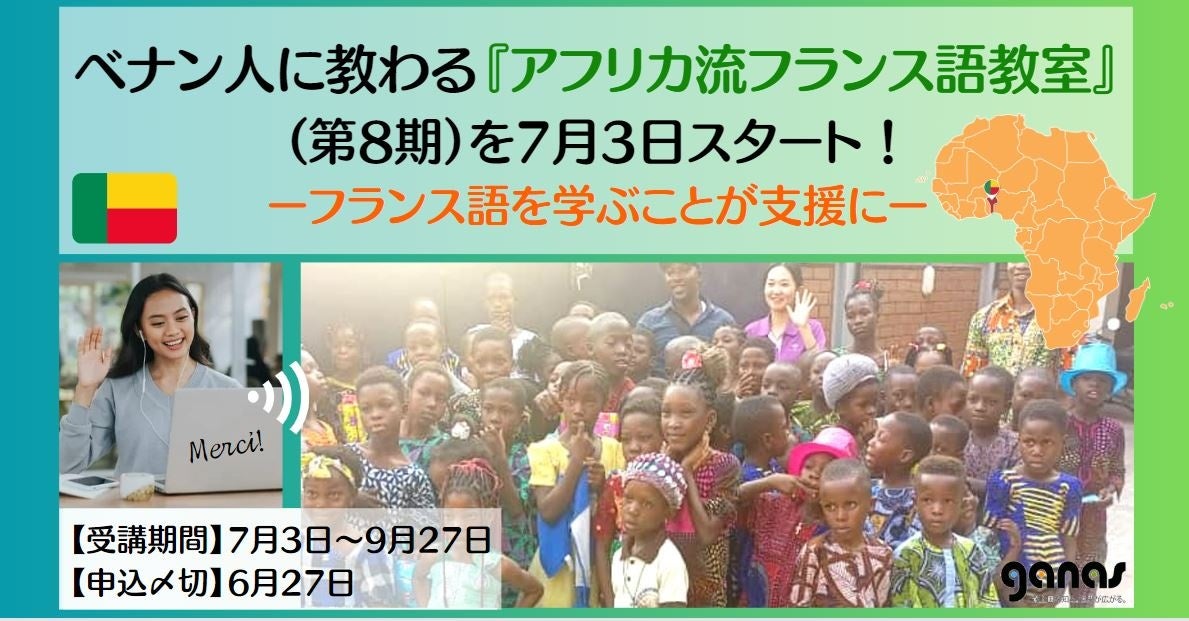 途上国に特化したNPOメディア「ganas」は7月3日の週から、アフリカのフランス語を学べて、しかもベナンの恵まれない子どもたちの教育も支援できる「ベナン人に教わる『アフリカ流フランス語教室』」(第8期)をZoomで開講します。