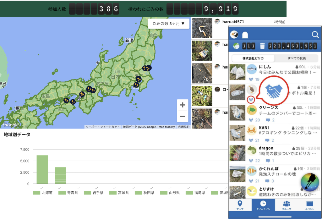 ごみ拾いSNS「ピリカ」をダウンロードして「プラごみバスターズ大作戦」のイベント参加ボタンを押せば、どなたでも参加いただけます。ごみを拾って投稿すると、ありがとうやコメントなどのコミュニケーションが生まれるだけでなく、皆が拾ったごみの数が自動で集計され、回収したごみの量や、どの地域でごみが多く拾われているかを確認することができます。